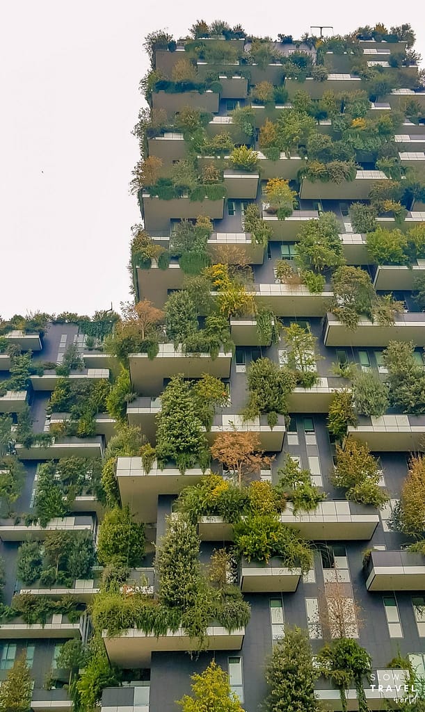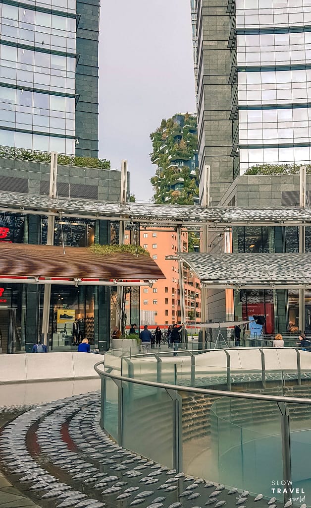 E, atrás desta praça, você verá o Bosco Verticale, um par de prédios residenciais de 76 e 110 metros de altura, totalizando 113 apartamentos. E assim como o nome diz, é uma verdadeira floresta vertical! Seu grande diferencial arquitetônico é sua cobertura verde composta por mais de 900 árvores, 4.000 arbustos e 2.000 plantas. E o mais incrível é que a rega é feita por um sistema de irrigação comandado por uma central computadorizada, que é alimentado de água da chuva.